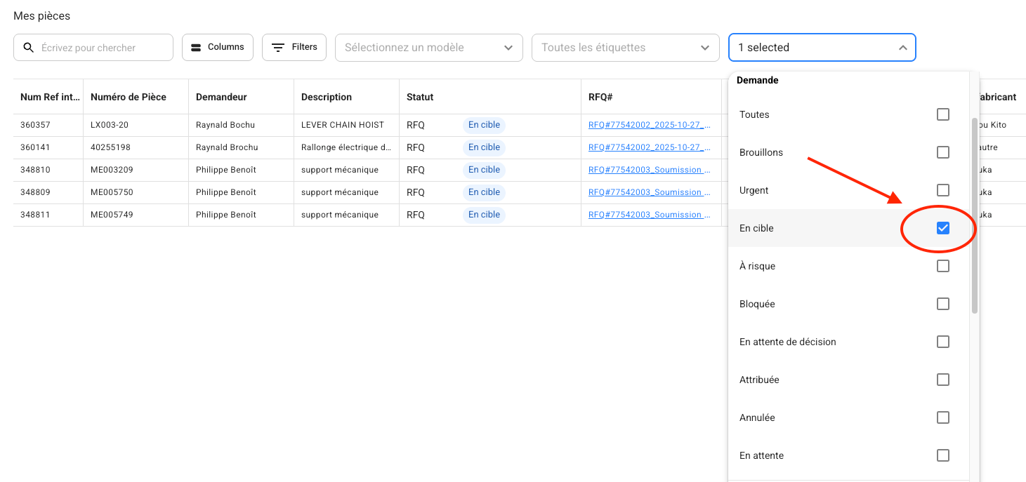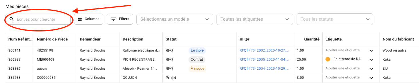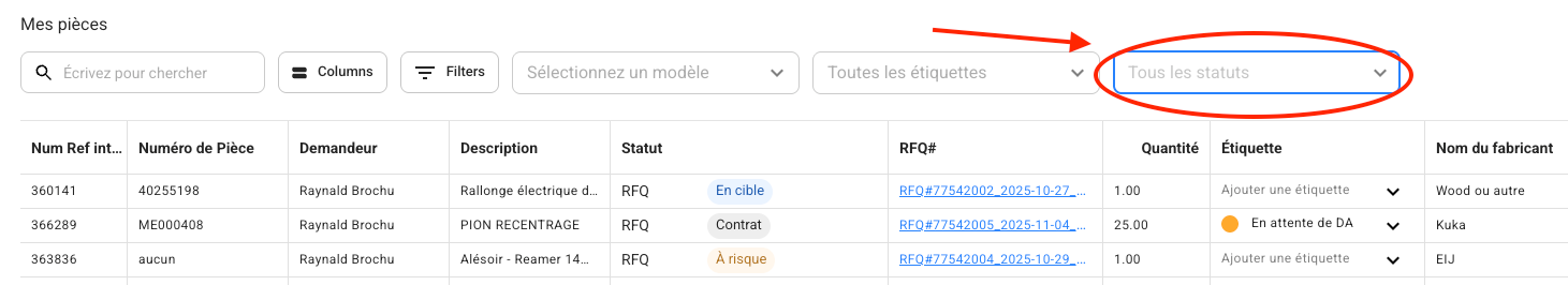 The Parts tab in Axya is an essential tool for purchase requesters, viewers, and buyers. It allows you to efficiently track part statuses, apply advanced filters, configure column display, and manage information effectively. This article explains the main features and best practices for using this tab.