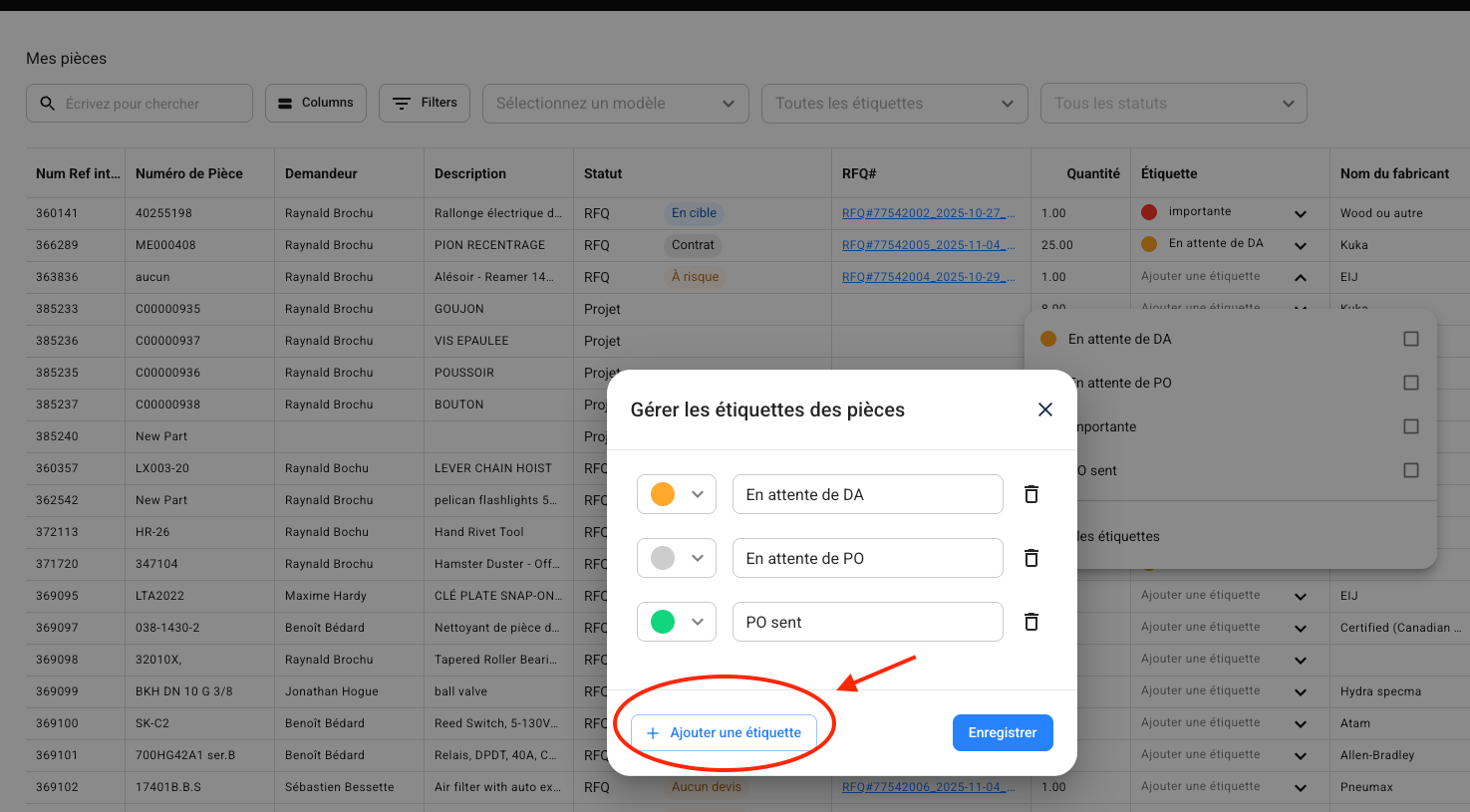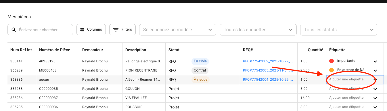 The Parts tab is a comprehensive tool that helps you analyze, organize, and efficiently track all parts in Axya. Column customization, the use of filters, and label management are essential for optimizing your experience.