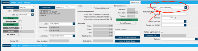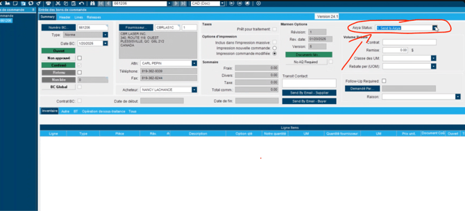 When your purchase order is ready for approval, update the Axya Status field located at the top right and select Send to Axya.