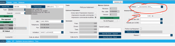 The Axya Status will then change to Successfully Sent, confirming that the order was transmitted to the supplier.