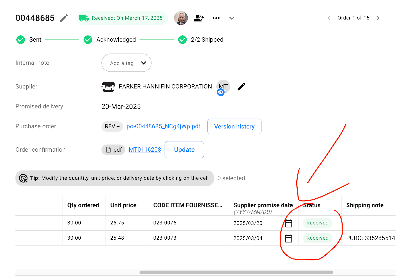 When the supplier confirms the order in Axya, the status will automatically update to PO Confirmed.
