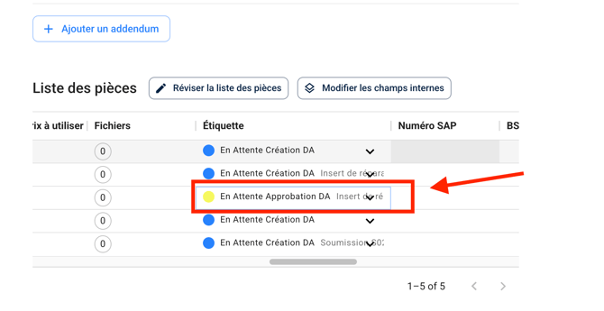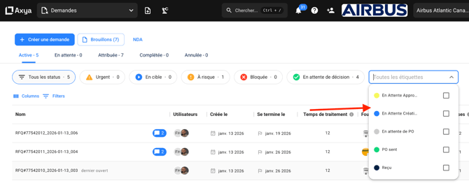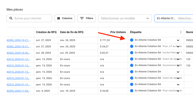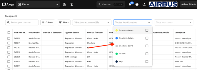 - Les étiquettes disponibles dans l’onglet Pièces sont les mêmes que celles dans l’onglet Demandes.
