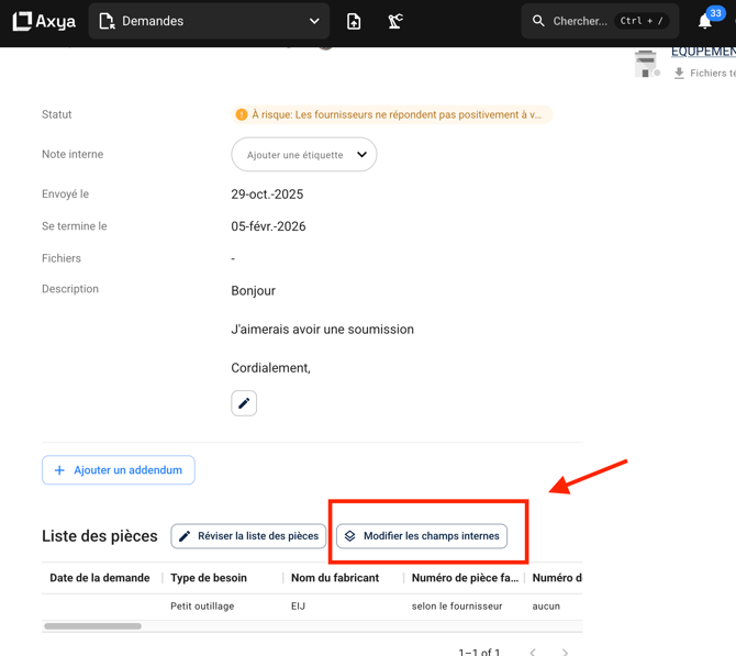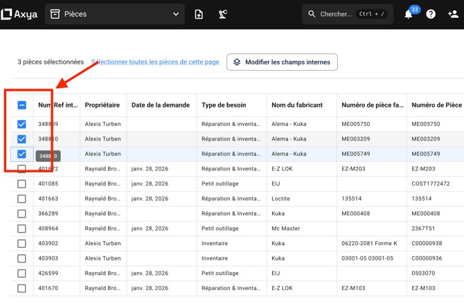 Résumé Cet article explique comment utiliser les éditions de masse et la gestion des étiquettes dans Axya afin de modifier efficacement plusieurs pièces à la fois, que ce soit depuis l’onglet Demandes ou l’onglet Pièces. Ces fonctionnalités permettent de gagner du temps tout en conservant la flexibilité de modifier des pièces individuellement lorsque nécessaire.