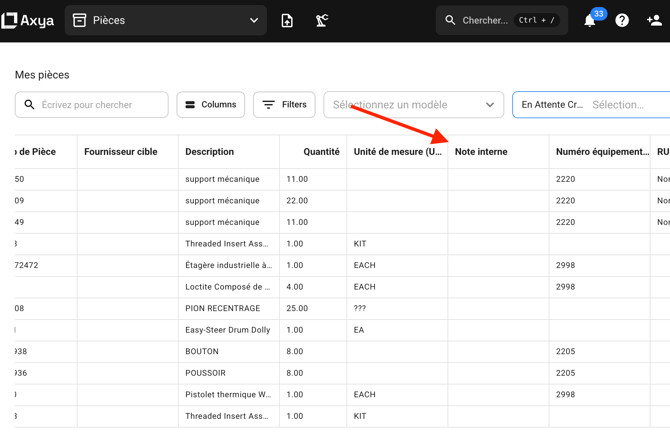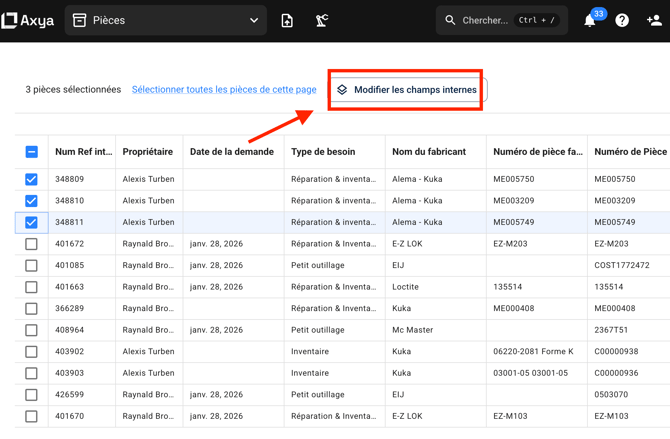 - L’édition de masse est aussi disponible directement dans l’onglet Pièces.