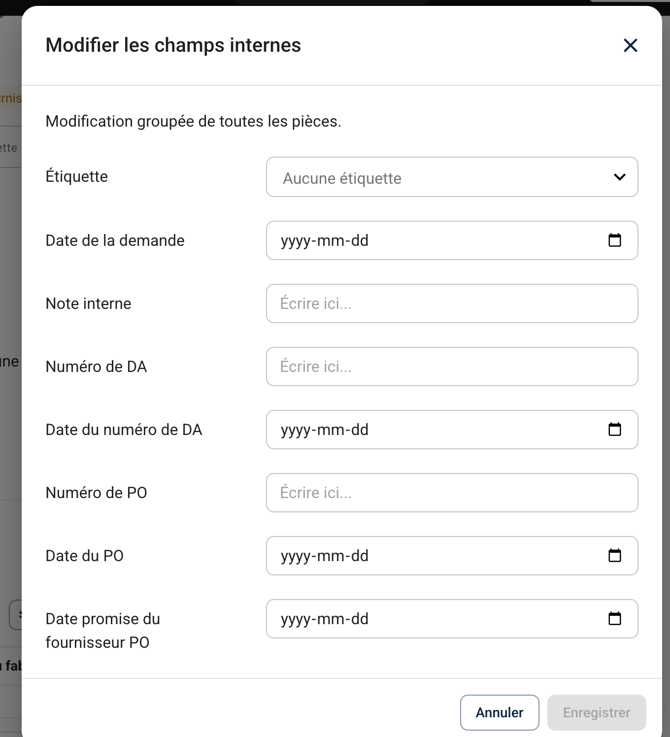 À partir d’une demande, il est possible de modifier en une seule action plusieurs champs internes pour toutes les pièces associées :