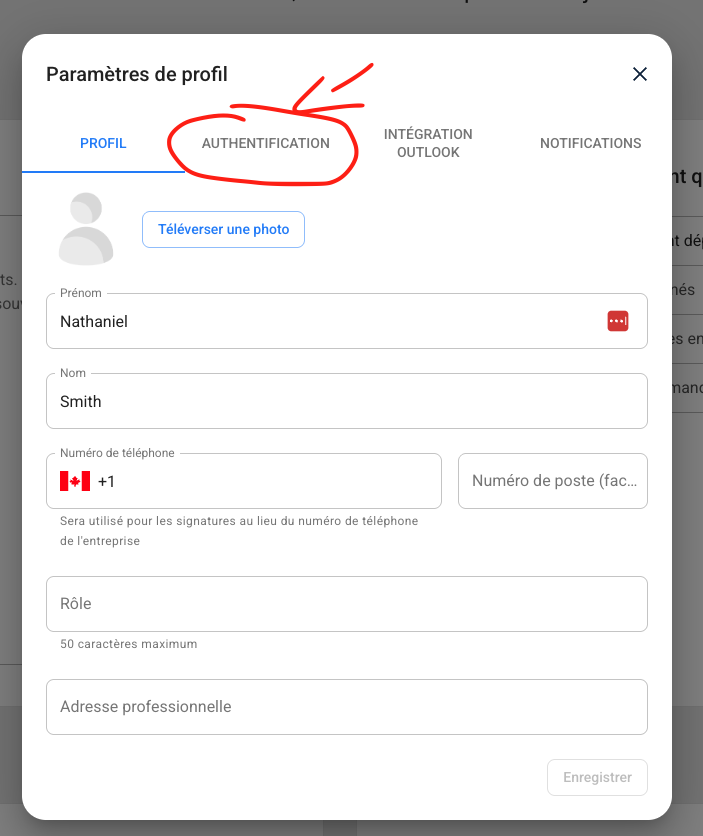 Retournez dans l’onglet Authentification sous Paramètres de profil.