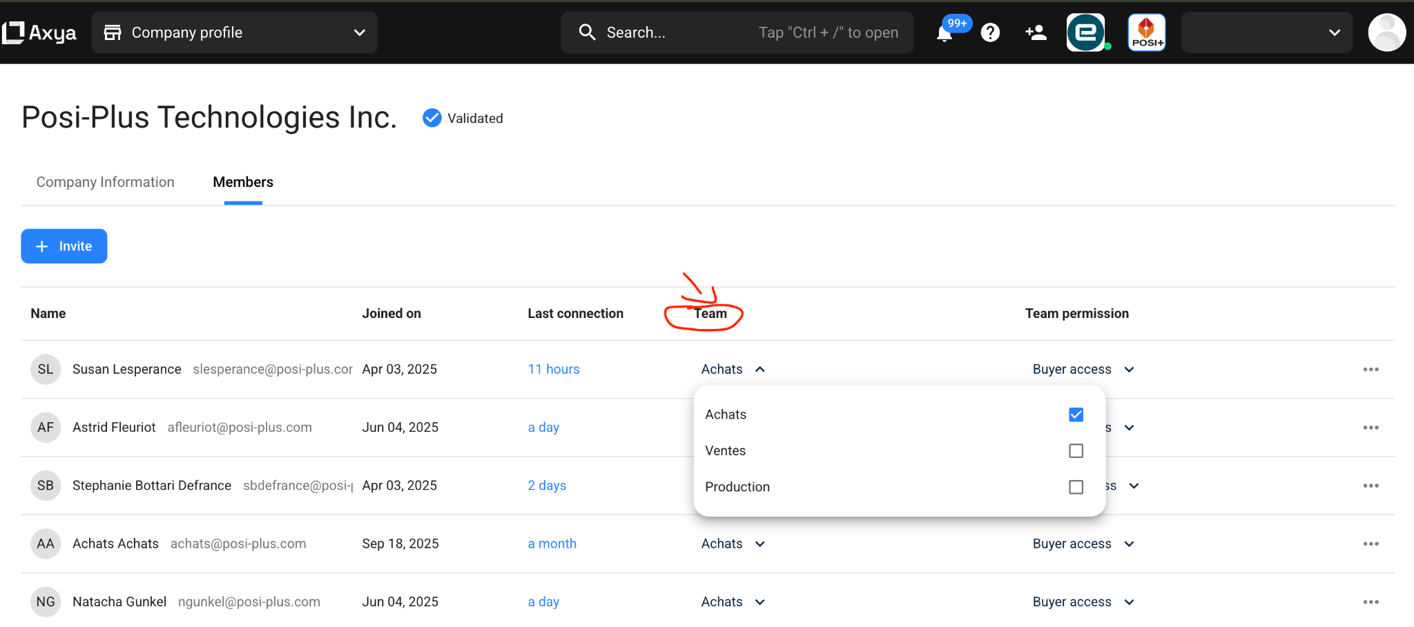 Cet article explique comment assigner un membre à une équipe dans votre compte Axya. Cette fonction vous permet de mieux organiser vos collaborateurs (ex. : équipes de ventes, production, approvisionnement) et de leur attribuer les bons accès selon leur rôle dans la plateforme.