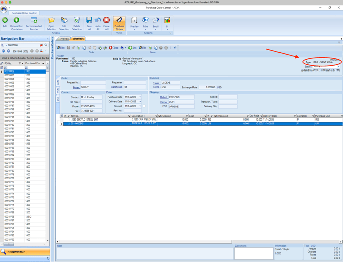 - Sélectionnez votre type de PO RFQ (ex. RFQ envoyé Axya).