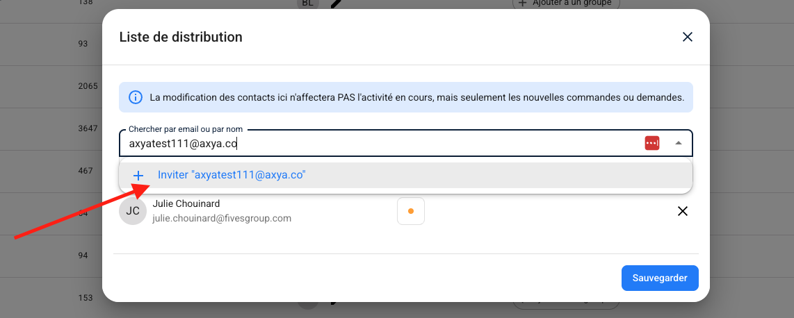 pour ajoutez un contact, entrer l'adresse courriel dans la barre de recherche. Si le contact existe déjà dans la base de données, une suggestion apparaitra, si non, cliquer sur (inviter) et remplir les données du contact