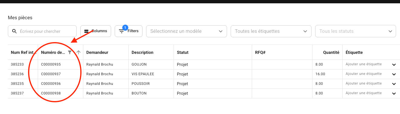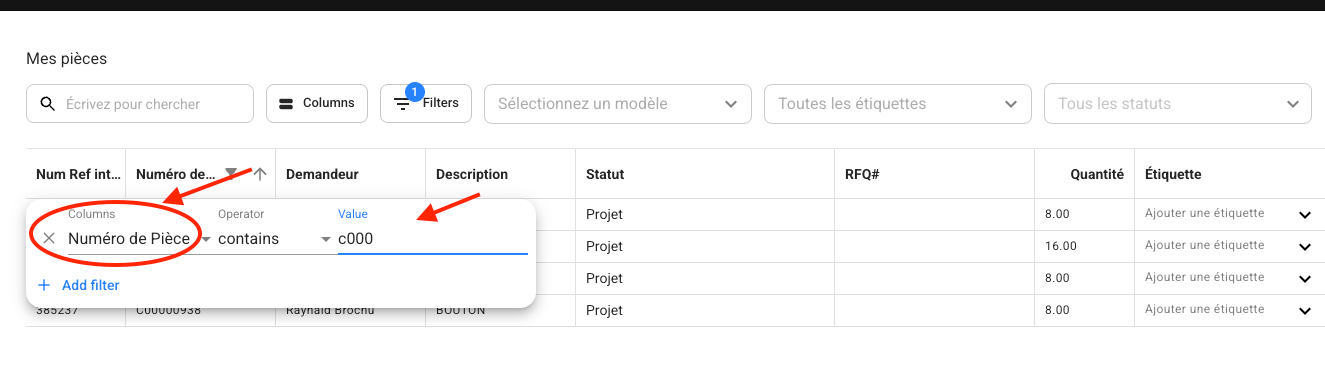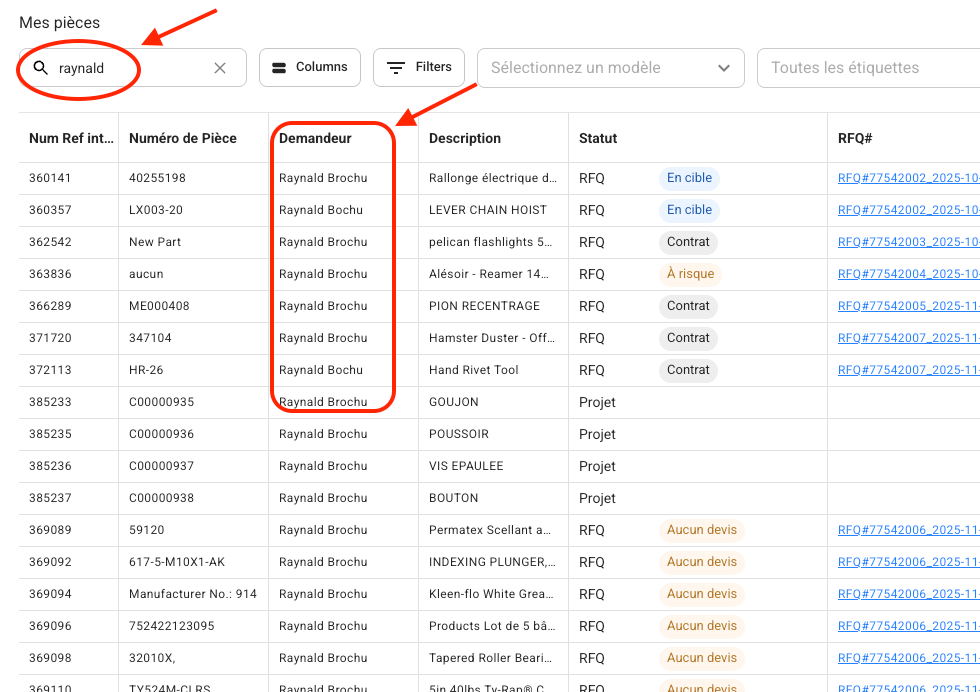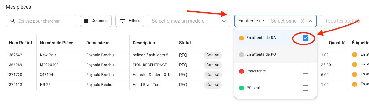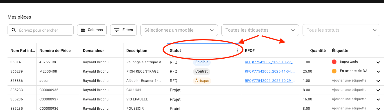 Plusieurs options de filtrage sont disponibles pour faciliter la recherche et l’analyse des pièces.