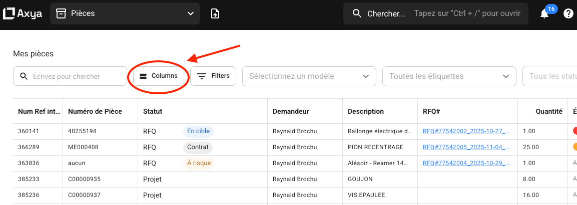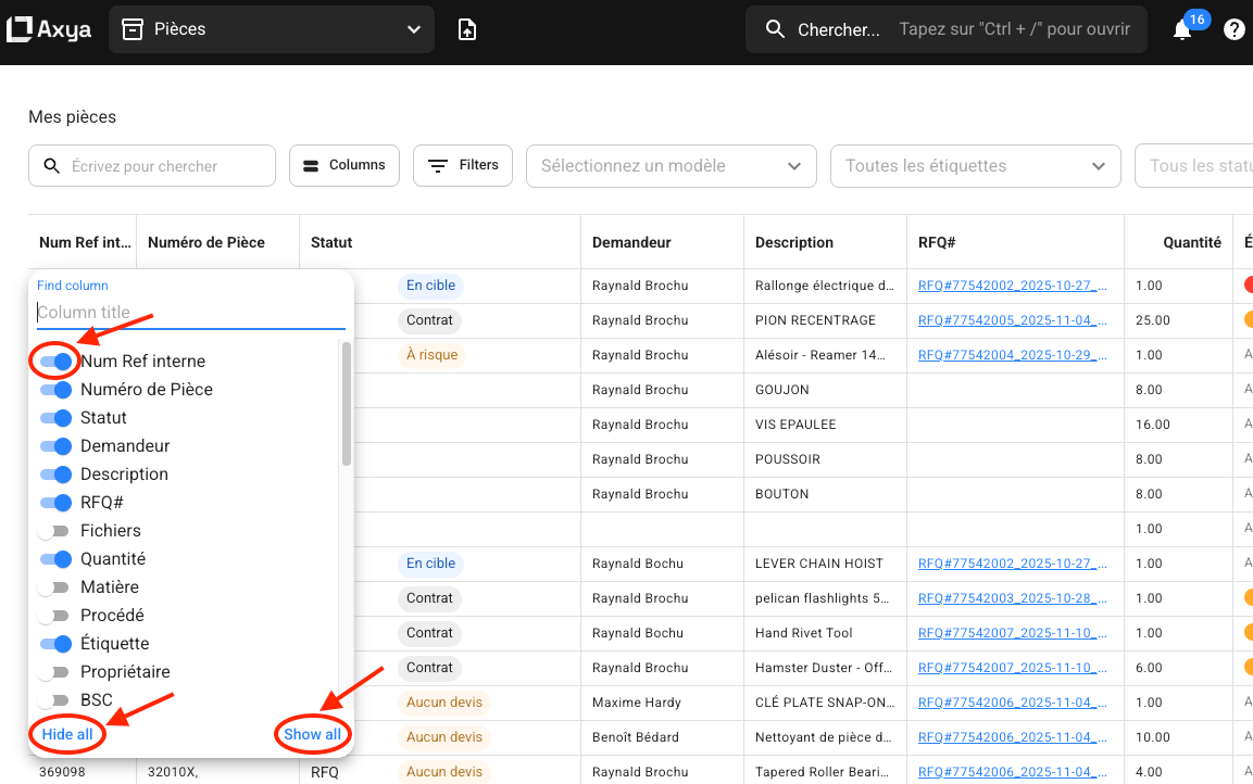 L’onglet Pièces dans Axya est un outil essentiel pour les requérants d’achat, les viewers, et les acheteurs. Il permet de suivre efficacement les statuts des pièces, d’appliquer des filtres avancés, de configurer l'affichage des colonnes et de gérer l’information de manière optimale. Cet article explique les principales fonctionnalités et meilleures pratiques pour utiliser cet onglet.