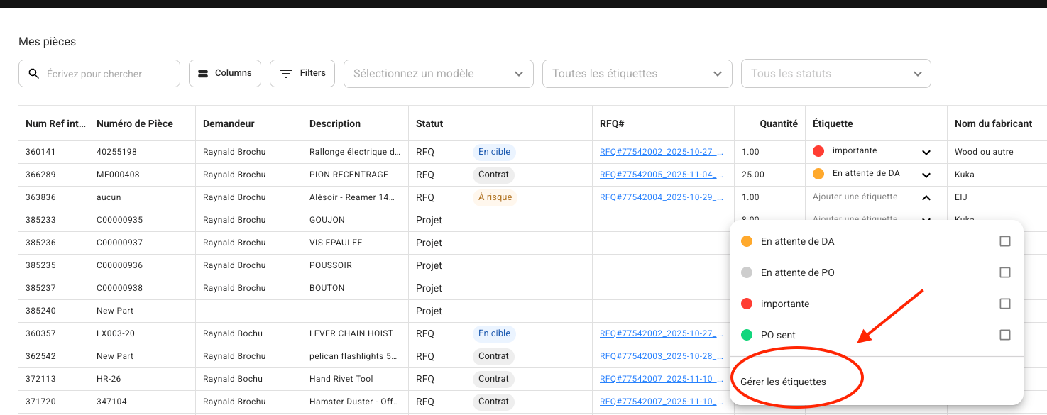 Les étiquettes permettent de catégoriser rapidement certaines pièces.