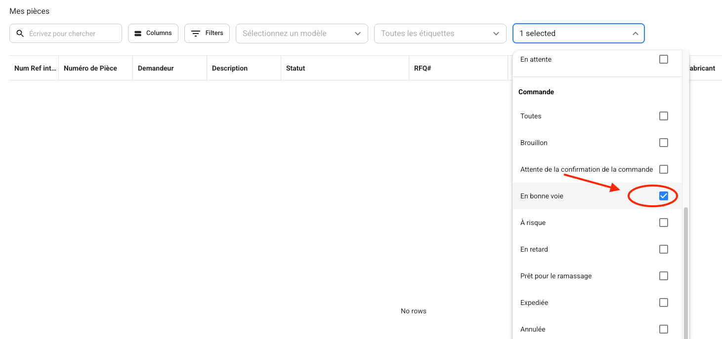 Vous pouvez sélectionner un statut pour voir toutes les pièces associées à des demandes dans cet état.